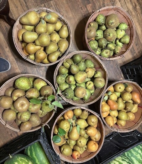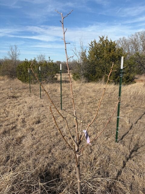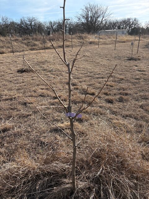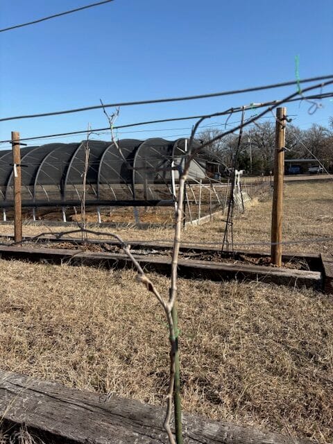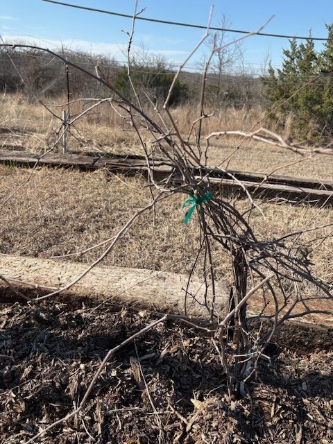 Initial winter pruning needs to occur while the grape vines are dormant. There is also a spring pruning, but that is less labor intensive than winter pruning, especially if your vines are still young. When you get plants at a nursery they usually just tie all the vine shoots together. To properly train your vines you need to eliminate multiple shoots and have one main shoot that becomes a strong trunk. From there, you need to train the vine to branch off in two or four cordons, depending on your support system. Your support system is very important. If it is not strong, it will not support the weight of the grapes. I’ve attached two pictures to provide an idea of winter grape pruning. One before the pruning and the other the finished product. Cottrell Country Farm plans to provide muscadine table grapes for sale at the Hillsboro Farmers Market in future years. This is the beginning of the project.